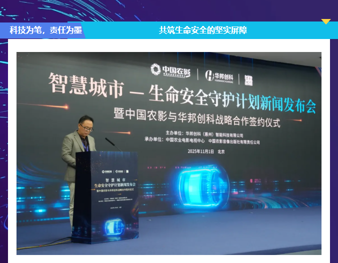 2025年11月01日,在北京“智慧城市——生命安全守护计划”新闻发布会现场,华邦创科(惠州市)智能科技有限公司—董事长刘定忠先生发表主题演讲,系统阐述了企业在智慧安全领域的战略布局与社会使命。